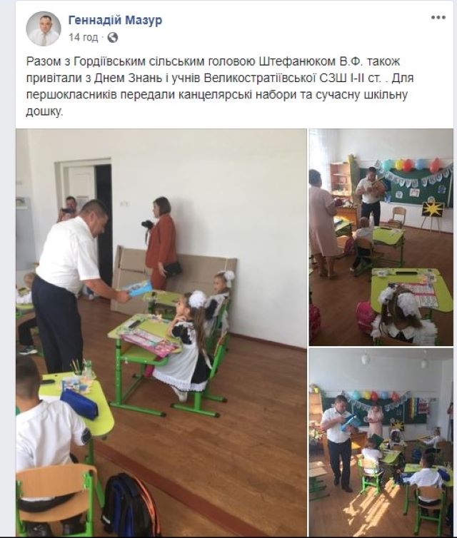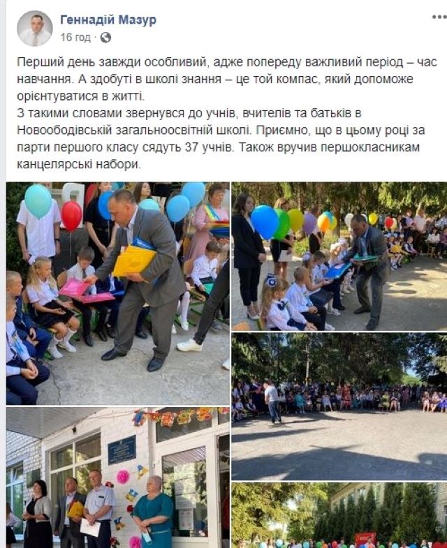 У п’ятьох школах на святі Першого дзвоника побував із дарунками депутат обласної ради Геннадій Мазур. Про це він 1 вересня поінформував на своїй сторінці в соцмережі «Фейсбук».