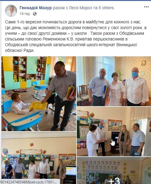 «Першого вересня усі дороги ведуть до школи, - зазначає Геннадій Мазур в одному зі своїх дописів, - Дітки бажають досягнути своєї мети у житті, знайти взаєморозуміння з вчителями та батьками, зустріти добрих і надійних друзів. Тому також завітав сьогодні до Тростянчицької загальноосвітньої школи, де привітав першокласників, вручив канцелярські набори та сучасну шкільну дошку - вже четверту для цього закладу».