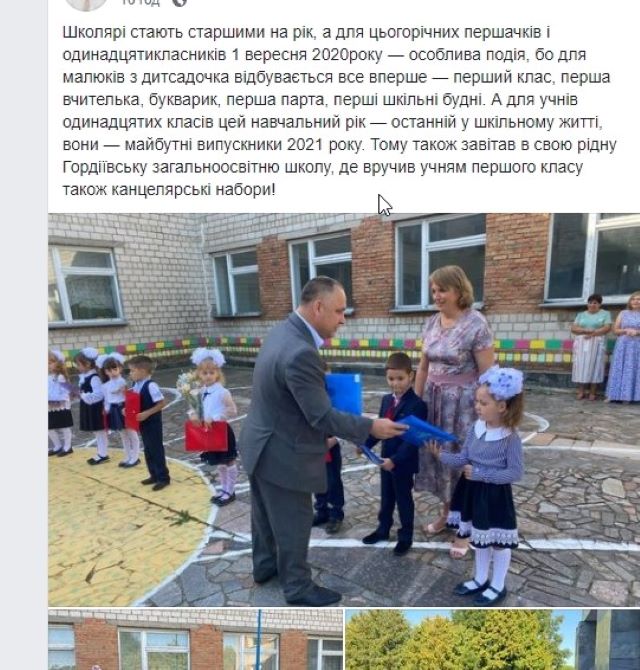 «… Також завітав в свою рідну Гордіївську загальноосвітню школу, де вручив учням першого класу також канцелярські набори!».