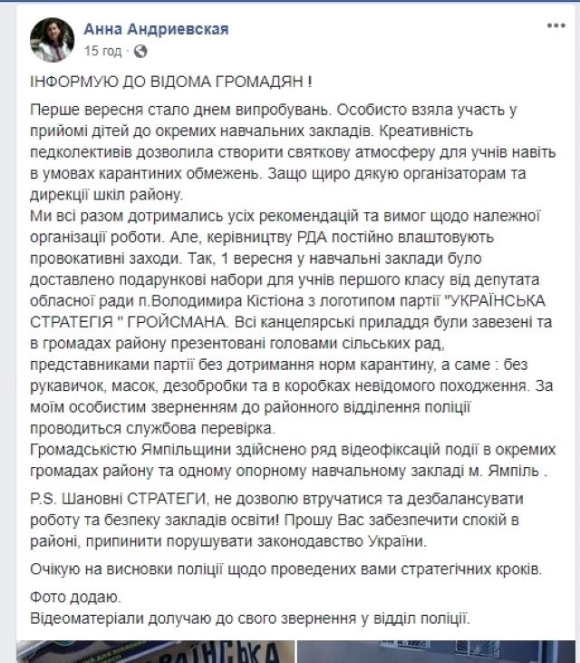 Також у соціальній мережі на сторінці Анни Андрієвської з’явився допис про те, що у навчальні заклади Ямпільщини було доставлено подарункові набори для учнів першого класу від депутата обласної ради Володимира Кістіона з логотипом партії «Українська стратегія Гройсмана».