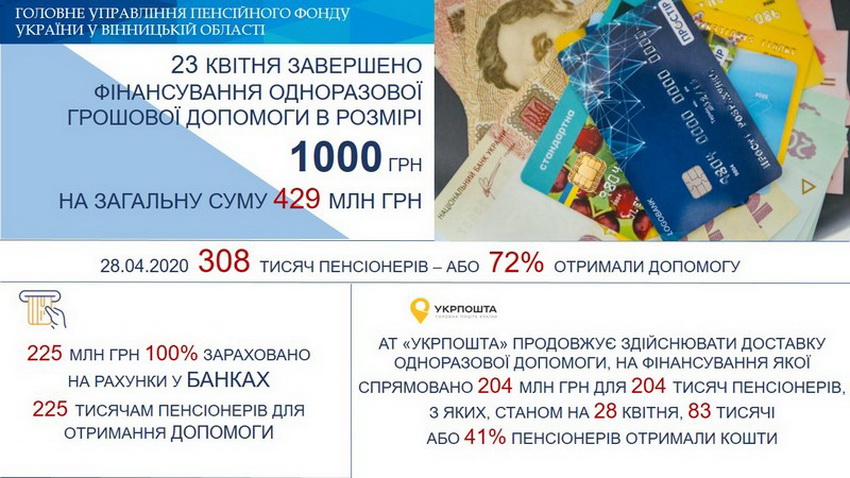 23 квітня Головне управління Пенсійного фонду України у Вінницькій області завершило фінансування одноразової грошової допомоги в розмірі 1000 грн. На даний вид виплати спрямовано 429 млн грн.