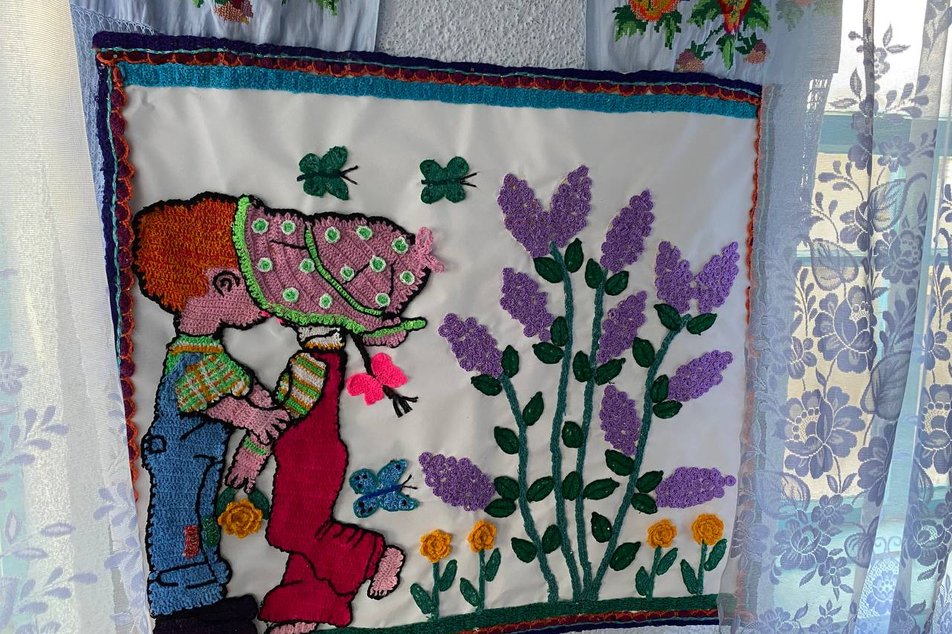 «Беру картину, обвʼязую, оздобила травичкою, квітами, овечками. Дивлюся, виходить. Все з голови. Уявляю собі картину і роблю. То калина, то гуцули, коні, поле, пташечки», – каже Марія Петрівна.