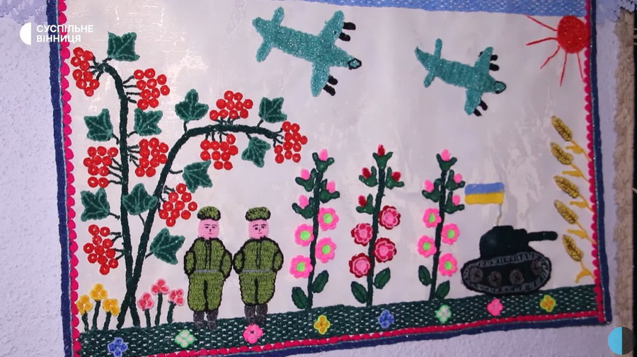 На одній з останніх картин, майстриня зобразила українських захисників, танк і літаки. Працювати над нею почала після повномасштабного вторгнення РФ.