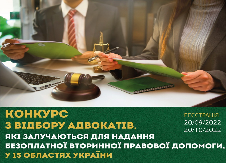 «Система надання безоплатної правової допомоги запрошує адвокатів узяти участь у конкурсі з відбору адвокатів, які залучаються для надання безоплатної вторинної правової допомоги, у 15 областях.