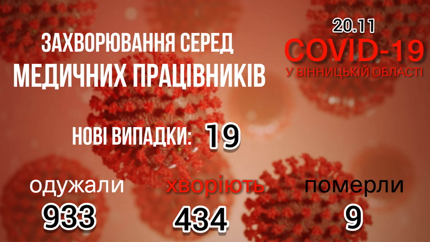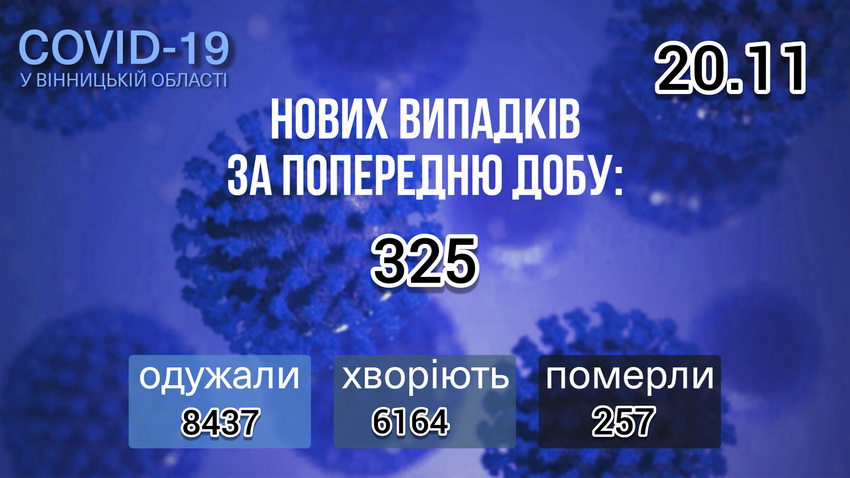 За інформацією Вінницької облдержадміністрації, станом на ранок 20 листопада, на Вінниччині виявили рекордні 325 нових випадків захворювання на коронавірус. Через ускладнення від коронавірусу напередодні померли 6 пацієнтів. За добу хворобу виявили у 19 медичних працівників.