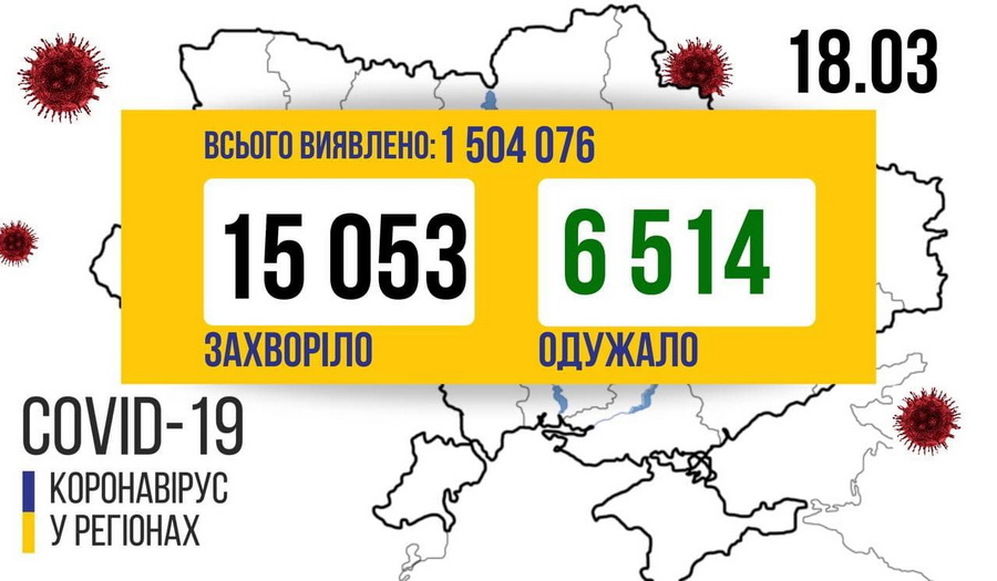 В Україні за минулу добу всього зафіксовано 15 053 випадків інфікувань. Одужали минулої доби 6 514 людини в Україні. Померли – 267 осіб.