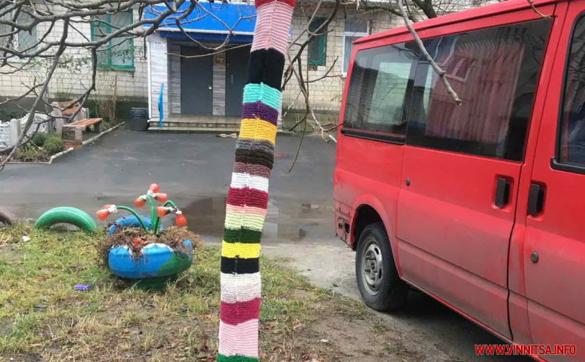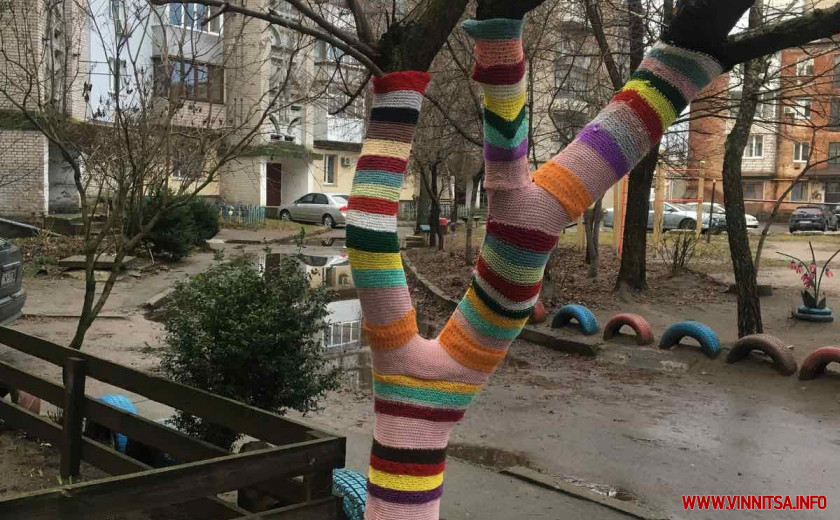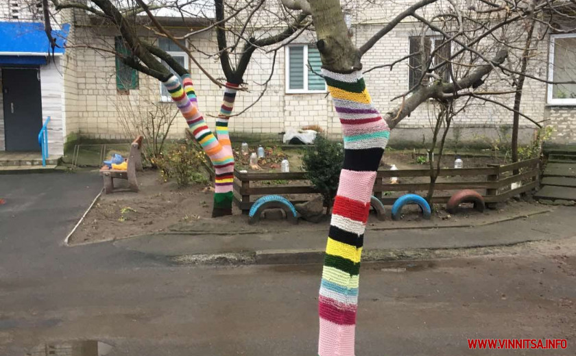 Любов Муковкина з містечка Гнівань, що на Вінниччині, утеплила п’ять дерев у дворі багатоповерхівки, де живе. Близько трьох тижнів жінка в’язала для них «одежину». Використала всі нитки, які були дома та й розпустила чимало особистих речей. Пані жартує, у кожного з дерев ексклюзивний виріб по його персональним об’єму та розміру.
