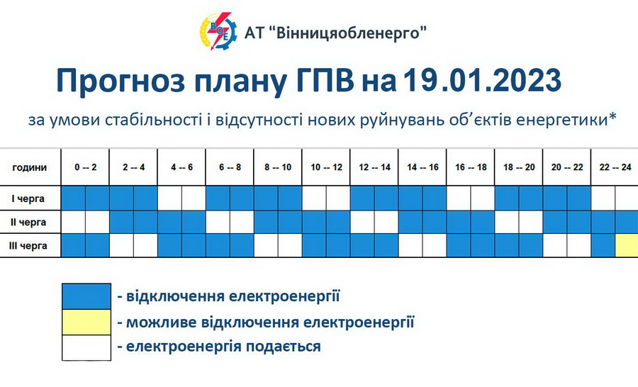 Відповідно до доведеної граничної величини споживання електричної потужності на 19 січня по Вінницькій області задіяно обмеження електроспоживання відповідно до графіка погодинного відключення.