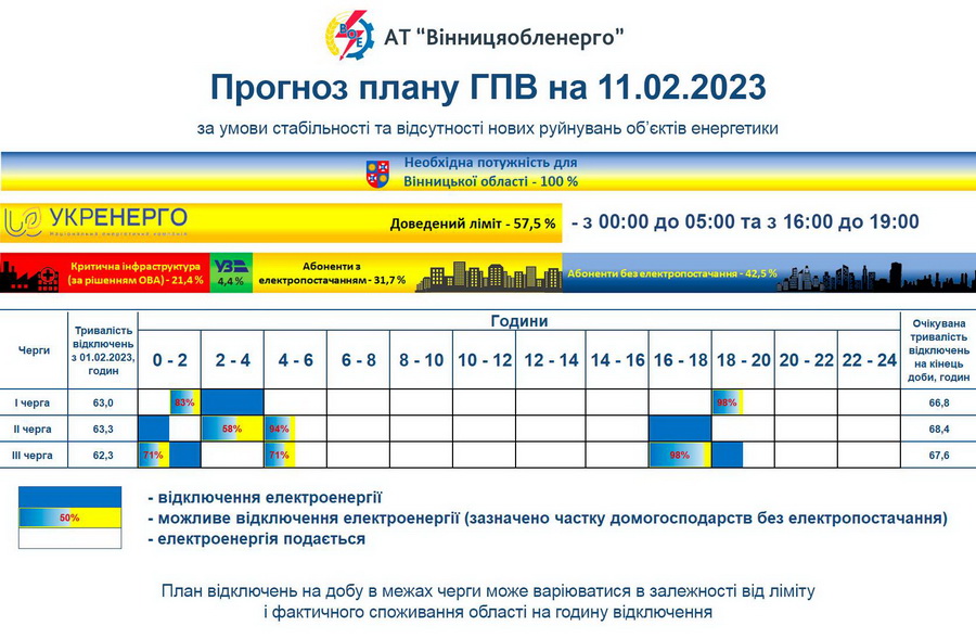 Відповідно до доведених лімітів НЕК «Укренерго» на 11 лютого з 00:00 до 05:00 та з 16:00 до 19:00 по Вінницькій області задіяно обмеження електропостачання відповідно до графіка погодинного відключення.