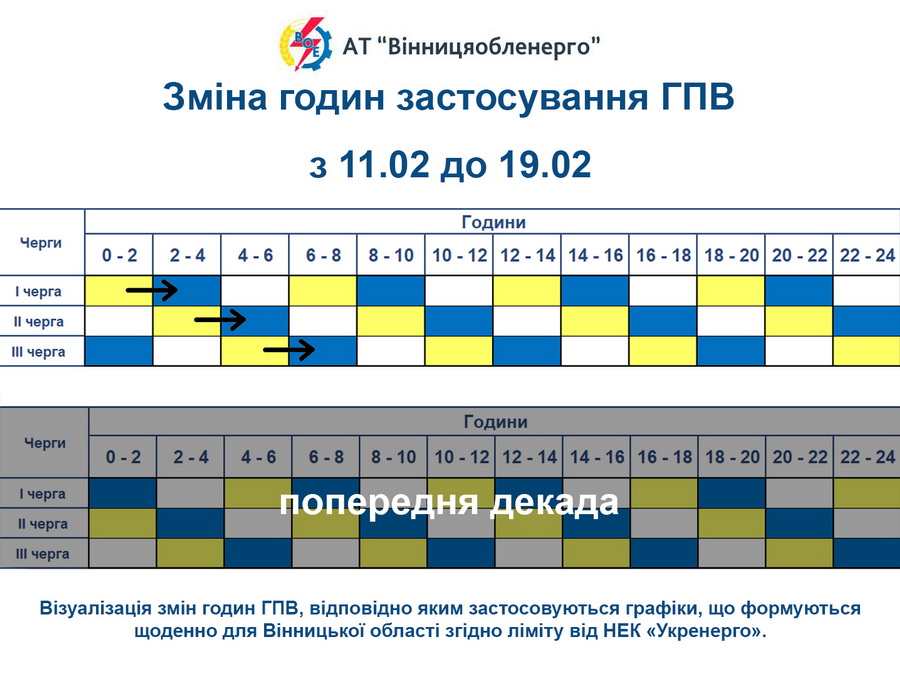 Також в обленерго додали, що з 11 лютого на Вінниччині «години вимкнень» кожної черги буде зміщено на 2 години вперед.