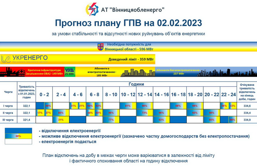 Відповідно до доведених лімітів НЕК "УКРЕНЕРГО" на 2 лютого по Вінницькій області задіяно рівномірне обмеження електропостачання відповідно до графіка погодинного відключення.