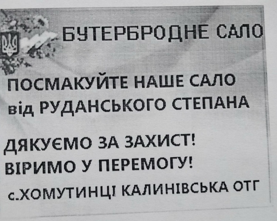 «Посмакуйте наше сало від Руданського Степана»: підписали банка із салом хомутинчани. Люди вірять, що скоро війна закінчиться і будинок культури, який тимчасово перетворився на цех з виготовлення бутербродного сала, знову зустрічатиме гостей на святкування дня народження Степана Руданського.