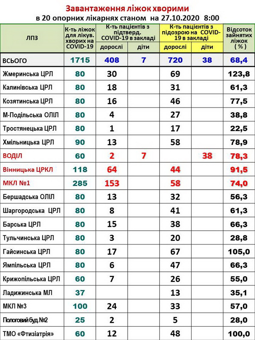 Станом на 27 жовтня на Вінниччині виявили 105 нових випадків захворювання на коронавірус. В 20 опорних лікарнях області розгорнуто 1715 ліжок для лікування хворих на коронавірусну інфекцію.