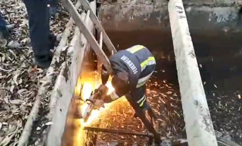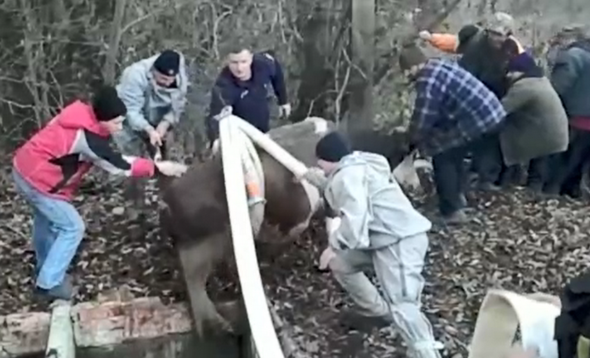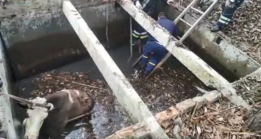 Тварина опинилась в ямі на глибині 4 мерти, яка була наповнена водою. Аби дістати корову, рятувальники розрізали металеві труби, між якими затисло тварину і відкачували воду.