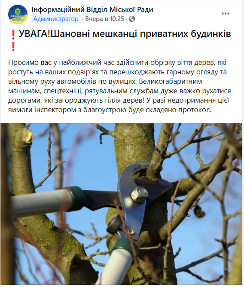 «УВАГА! Шановні мешканці приватних будинків. Просимо вас у найближчий час здійснити обрізку віття дерев, які ростуть на ваших подвір’ях та перешкоджають гарному огляду та вільному руху автомобілів по вулицях. Великогабаритним машинам, спецтехніці, рятувальним службам дуже важко рухатися дорогами, які загороджують гілля дерев! У разі недотримання цієї вимоги інспектором з благоустрою буде складено протокол», - зазначено в дописі.