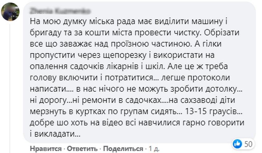 Гніванчани в коментарях пишуть, що міська рада мала б виділити машину та бригаду і за кошти міста провести чистку. А гілки пустити на щепу, яку використати на опалення садочків лікарень і шкіл.