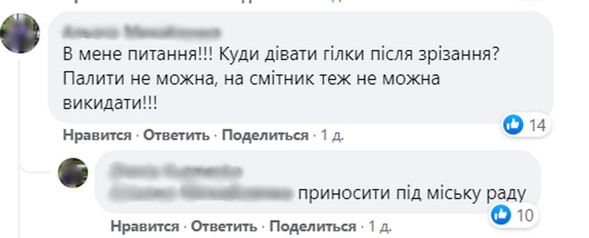 Інші жителі громади також ставлять питання, куди дівати зрізане гілля, якщо спалення сміття заборонено.