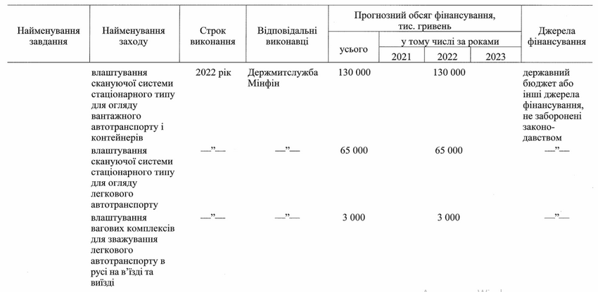 На влаштування скануючої системи стаціонарного типу для огляду вантажних транспортних засобів та контейнерів в Могилів-Подільському пункті пропуску на 2022 рік передбачено 130000 тис грн