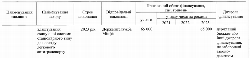 На влаштування скануючої системи стаціонарного типу для огляду легкових автомобілей в Могилів-Подільському пункті пропуску на 2022 рік передбачено 65000 тис грн