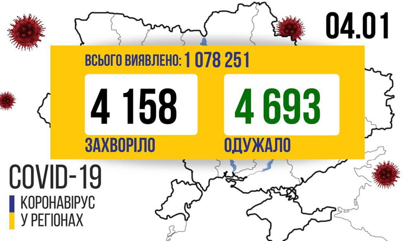 Загалом по Україні – 4 158 нових випадків COVID-19. Внаслідок ускладнень, викликаних хворобою, минулої доби в Україні померли 73 пацієнта (з початку епідемії померли 18 927 громадян). Одужали за минулу добу – 4 693 пацієнтів.