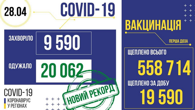 Одужали 20 062 людей. За минулу добу 9 590 нових випадків інфікувань. Померли 441 пацієнтів. За минулу добу щеплено 19 590.
