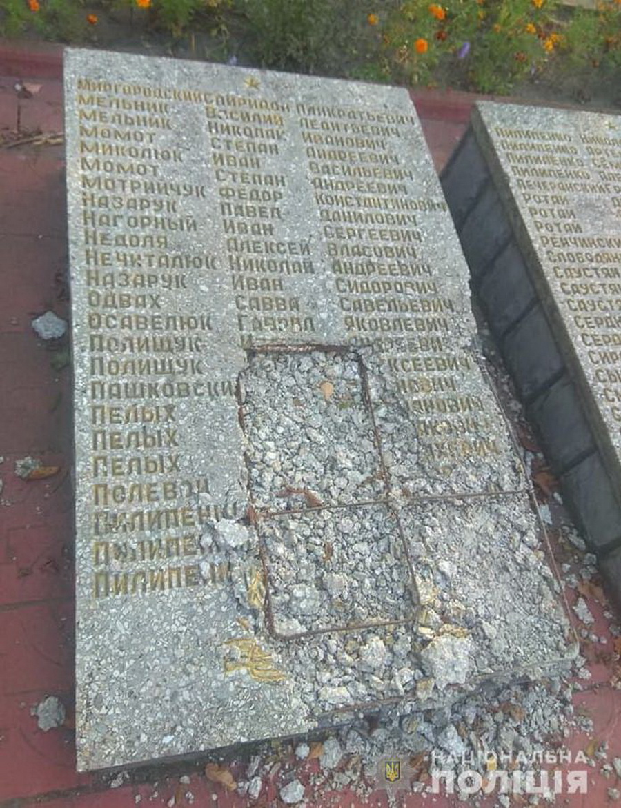 До поліції надійшло повідомлення від селищного голови про те, що у смт Дашів невідома особа пошкодила бетонну плиту, на якій викарбувані прізвища загиблих воїнів у Другій Світовій війні. За словами керівника Гайсинського районного управління поліції Ігоря Соломона, в ході проведення першочергових розшукових заходів поліцейські встановили особу, причетну до вчинення злочину. Ним виявився раніше судимий 37-річний місцевий мешканець. Зловмисника поліцейські розшукали за місцем проживання.