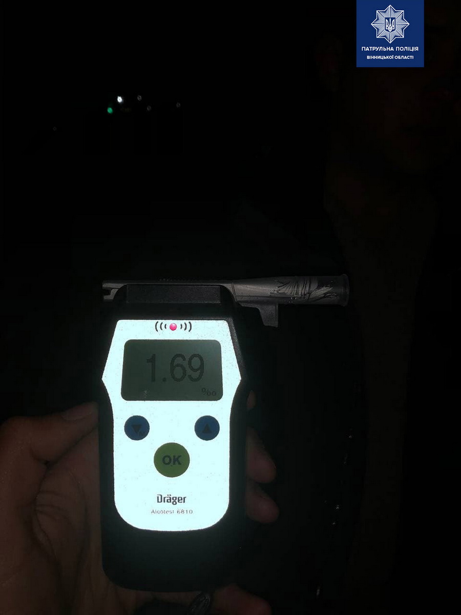 В ніч на 18 березня на автодорозі М-12 вінницькі патрульні зупинили автомобіль, водій якого намагався спочатку втекти. Під час спілкування з водієм, патрульні виявили, що він у стані алкогольного сп’яніння. Алкотестер показав 1,69 проміле алкоголю.