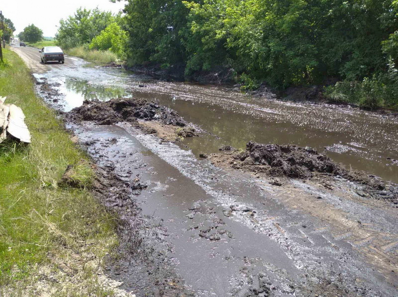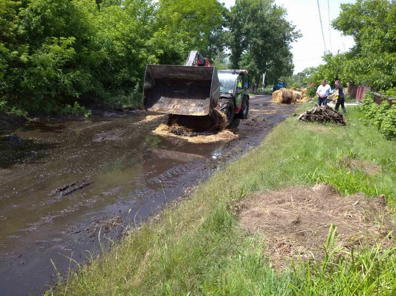 Розлиту рідину намагалися прибрати за допомогою тюків соломи. Люди припускають, що вантажівки перевозили речовини з біогазового комплексу МХП, який знаходиться в сусідньому селі Василівка. Там переробляють курячий послід та інші відходи бройлерів.
