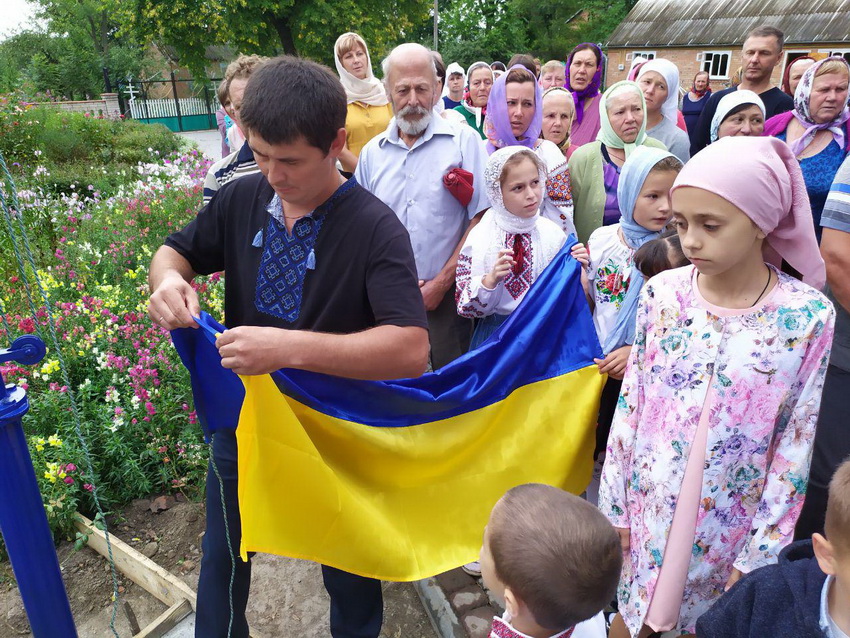 Після вінчання та вітань, громада Свято-Миколаївського храму Православної Церкви України урочисто встановила біля своєї церкви державний прапор України.