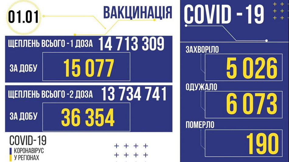 Станом на 1 січня 2022 року, в Україні коронавірусною інфекцією захворіли +5 026 людини (дітей – 262, медпрацівників – 74). З них - 159 осіб з Вінниччини. Згідно зі статистикою МОЗ, у нашому регіоні через цю хворобу, померли 14 пацієнтів. Одужали протягом доби – 369-ть мешканців області.