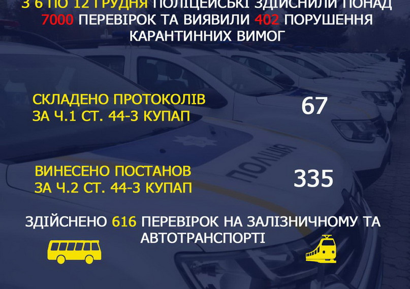 Також, винесено 335 постанов за ч. 2 ст. 44-3 КУпАП (перебування в громадських будинках, спорудах, громадському транспорті під час дії карантину без захисних масок), з них 175 – на пасажирів громадського транспорту.