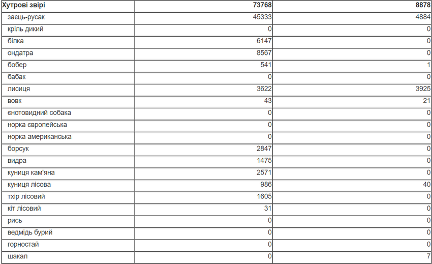 В головному управлінні статистики у Вінницькій області оприлюднили інформацію про кількість мисливських тварин та їх добування за видами у 2020 році.