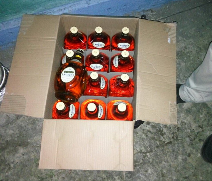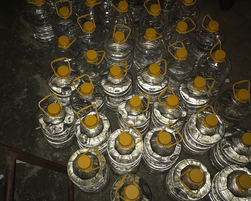 Під час обшуку виявлено і вилучено 6 пластикових бочок заповнених рідиною з характерним запахом спирту орієнтовним об’ємом 200 літрів кожна, 2 пластикові бочки ємністю 200 літрів, наполовину заповнених рідиною з характерним запахом спирту, 53 пластикові ємності об’ємом по 5 літрів кожна із водно-спиртовою сумішшю, 11 ємностей типу "bag in box" по 10 літрів кожна заповнених водно-спиртовою сумішшю, алкогольні напої іноземних брендів в кількістю 78 пляшок по 1 літрі кожна,а також банківські платіжні картки, чорнові записи з замовленнями, крани, шланги, насоси, пістолет для склеювання, електроні ваги, фільтри для очистки води.