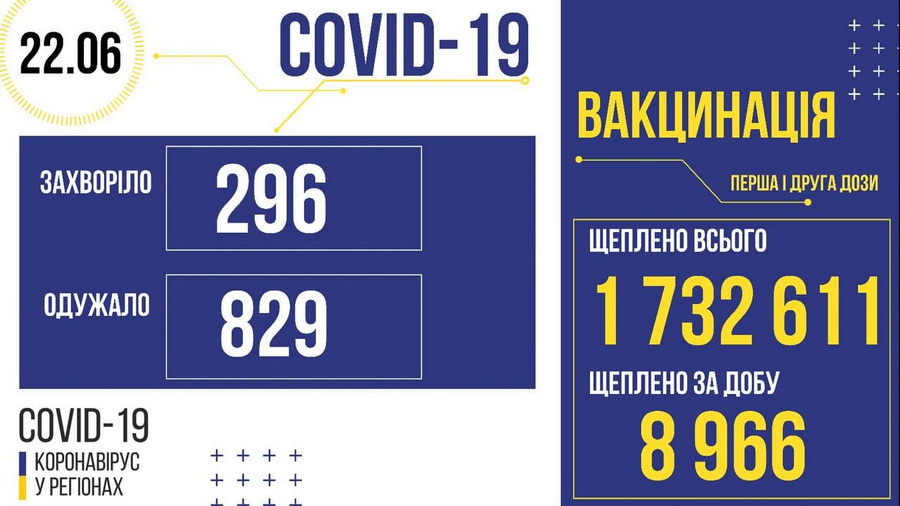 В Україні за добу одужали 829 людей. Захворіли – 296. Померли – 21. Вакцинувалися протягом доби 6 571 + 2 395. Загалом проведено 1 732 611 вакцинацій.