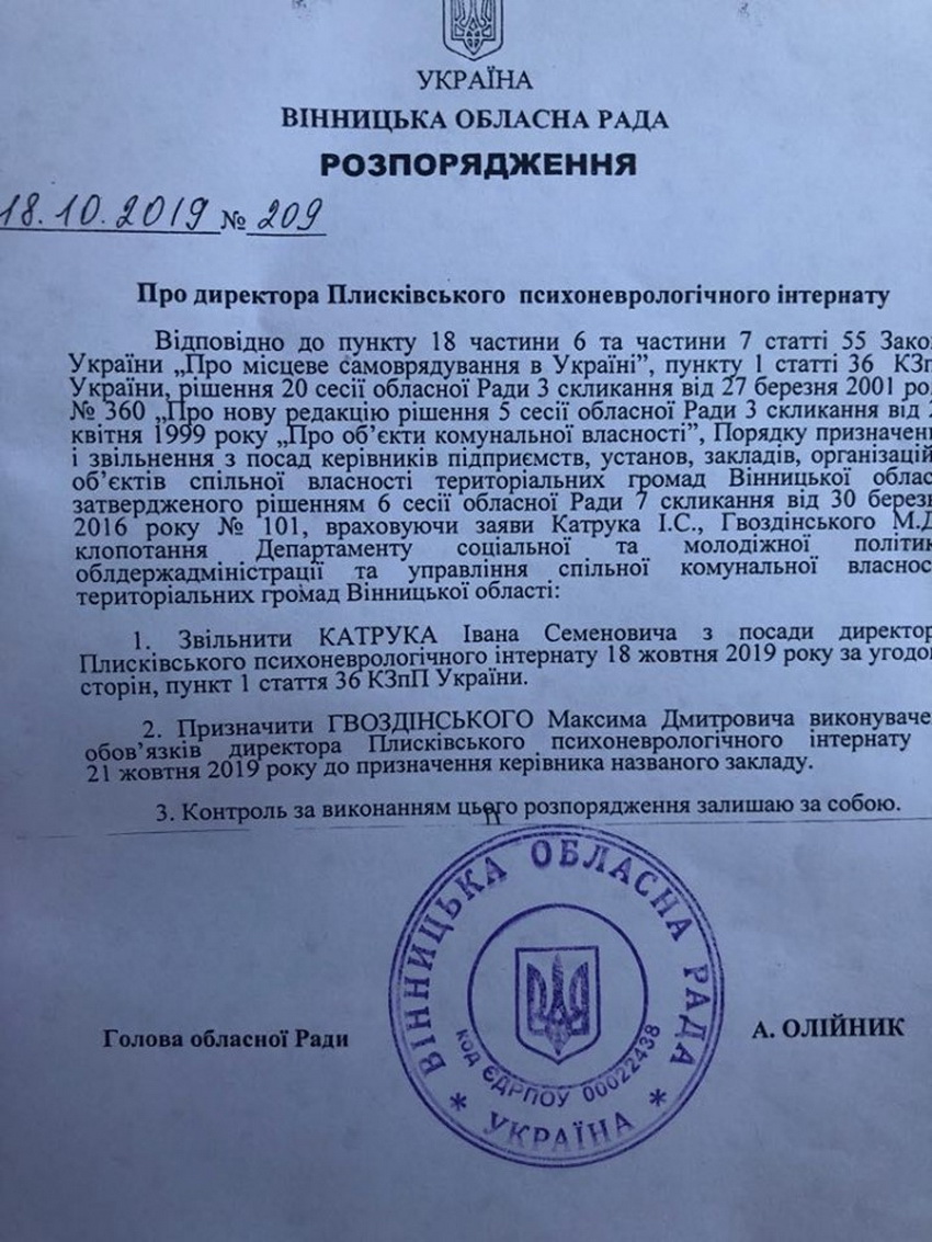 18 жовтня голова Вінницької облради Анатолій Олійник підписав розпорядження про звільнення Івана Катрука «за угодою сторін».