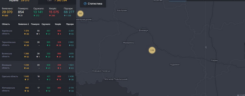 Всього по Україні від початку спостереження зареєстрували 29 070. Одужав 13 141 пацієнт, загинули - 854. Загалом, за добу в Україні зафіксували 689 нових випадків захворювання на COVID-19.