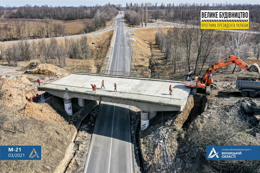 Також на Вінниччині в рамках програми «Велике будівництво» продовжують ремонт шляхопроводу на автомобільній дорозі М-21 «Виступовичі – Житомир – Могилів-Подільський біля села Сьомаки Жмеринського району. Завершення робіт заплановане на 2021 рік.