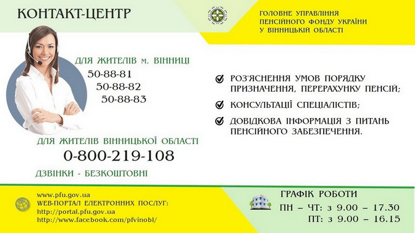 З березня 2020 року розпочав роботу обласний контакт-центр Головного управління Пенсійного фонду України у Вінницькій області. Телефонні дзвінки приймають з усього регіону.