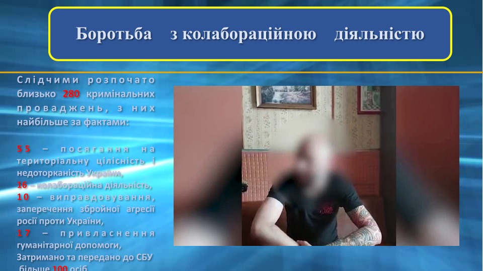 По інших фактах, у помешканнях правопорушників проведено обшуки, в ході яких виявлено та вилучено контент проросійського характеру, інші докази, що вказують на їх протиправну діяльність. Більше сотні таких осіб затримано та передано до Служби безпеки.