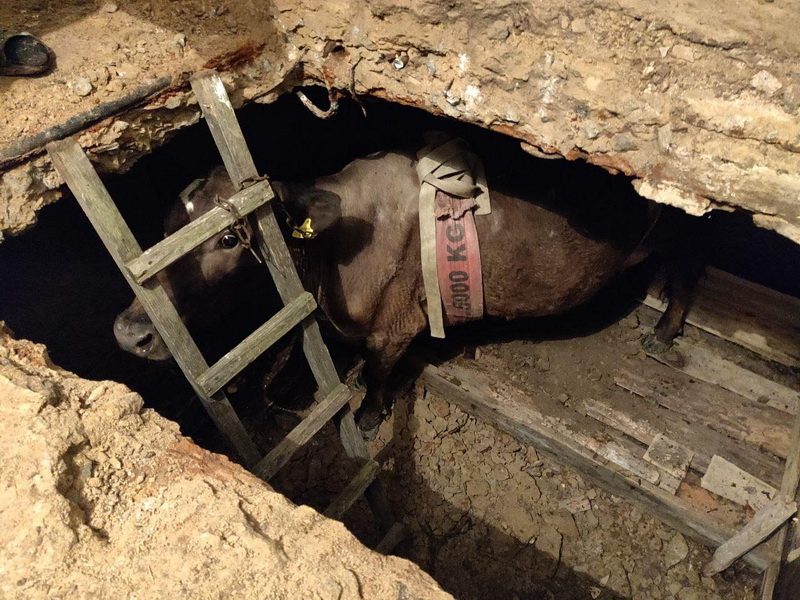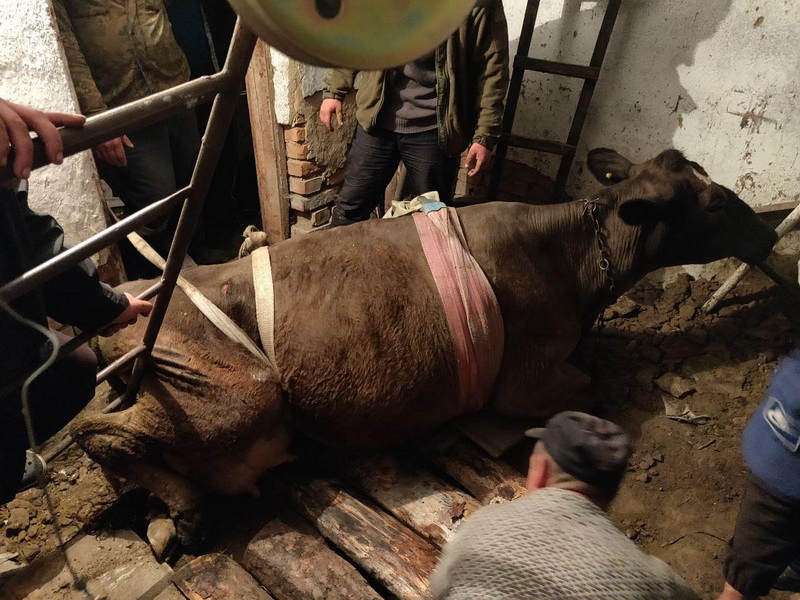 Ситуація трапилась у Калинівській територіальній громаді на вул.Шевченка в с. Гущинці. Тварина провалилась у льох. Витягнути корову самотужки власник не зміг, тому довелось викликати рятувальників.