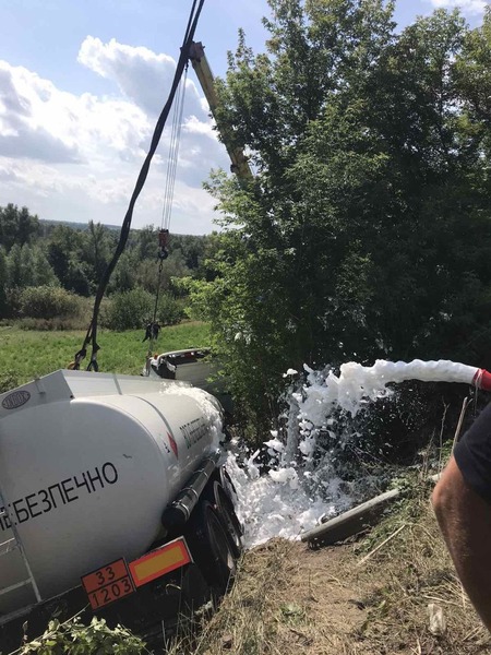 Внаслідок чого, сталася розгерметизація цистерни та почався витік паливо-мастильних матеріалів. Аби запобігти виникненню загоряння рятувальники одразу подали на автоцистерну піноутворюючу суміш.