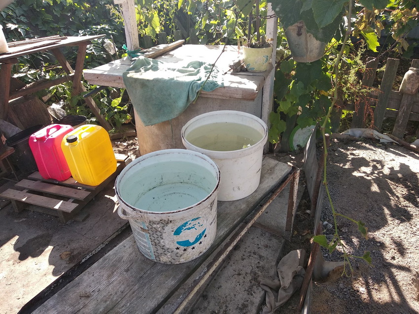 «Приніс мені бутлі, то там в веранді стоять бутлі. Кому далеко ходити по воду – копають нові криниці. А в школу, ось у такій діжці привозять технічну воду. Нею там миють підлогу, поливають квіти та вазони», - каже вона.