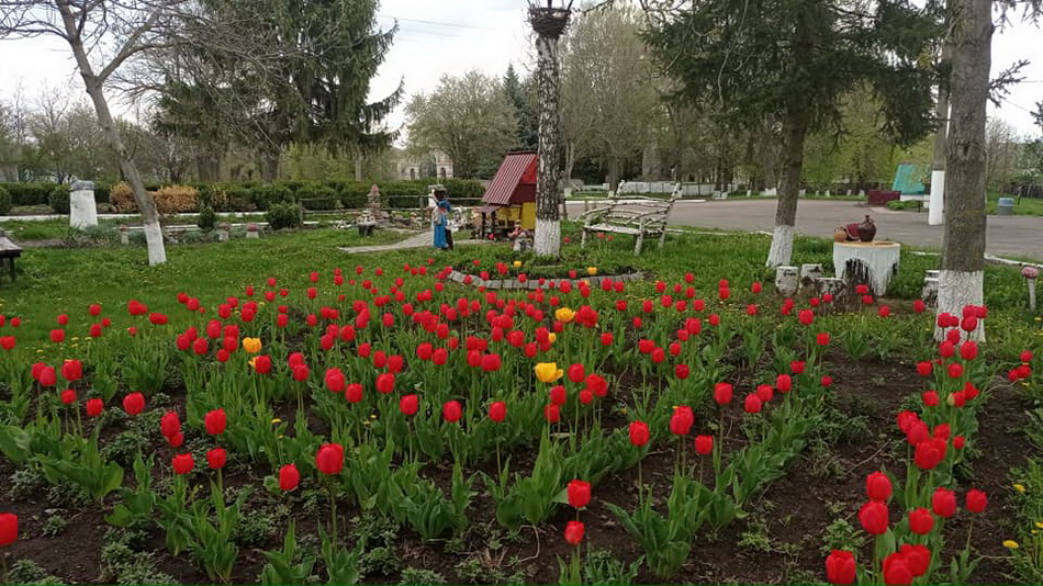 Наразі, з понять безпеки, назву населеного пункту ми не вказуємо. Зауважимо, що село заслуговує на окрему увагу своєю активною позицією у розвитку культури. Напередодні Великодня там сплели велетенський кошик з гігантських розмірів муляжів ковбаси, паски, яєць. Також, майстриня-самоучка створює авторські роботи з бетону та прикрашає ними сільський парк та музей. А зараз, місце масового відпочинку ще й потопає у тюльпанах, які висадили напередодні.