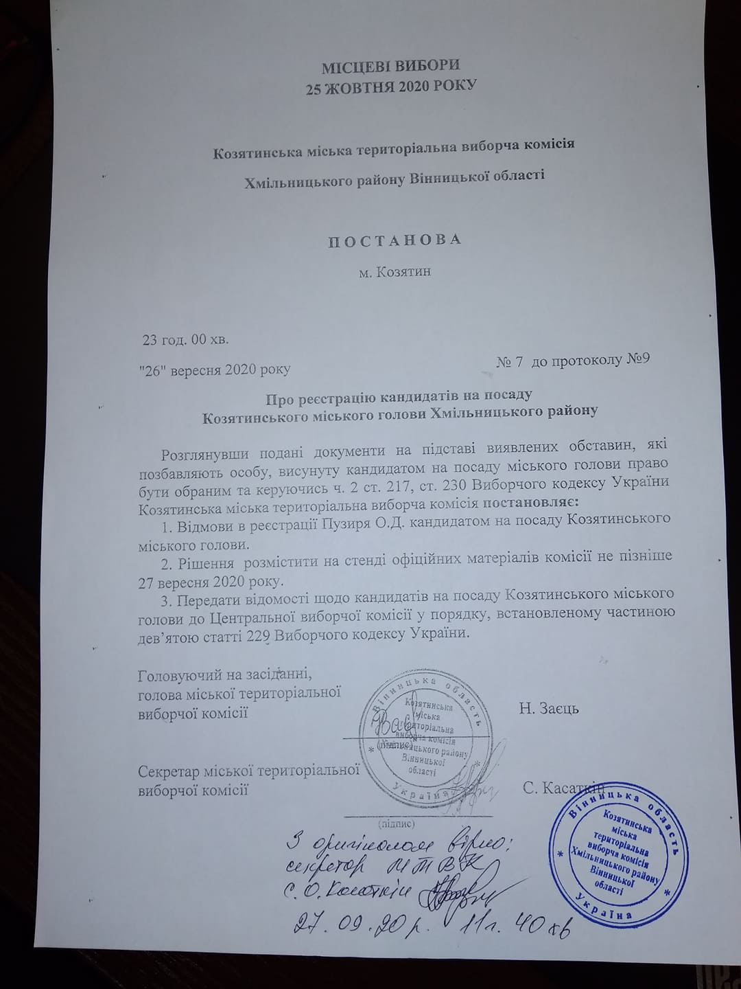 26 вересня Козятинська міська ТВК Хмільницького району Вінницької області винесла постанову про розгляд документів щодо реєстрації кандидата на посаду міського голови та кандидата у депутати Козятинскої міської ради на місцевих виборах 25 жовтня 2020 року від чинного міського голови міста Козятин Олександра Пузира, якою відмовила йому в реєстрації. Про це повідомляє громадська мережа ОПОРА.