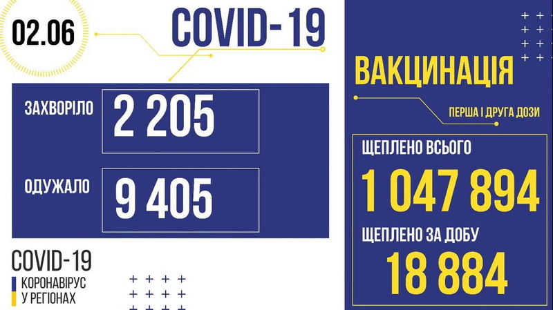 В Україні за добу одужали 9 405 людини. Захворіли –2 205. Померли –158. Щеплено – .15 977. Загалом проведено 1 047 894 вакцинацій.