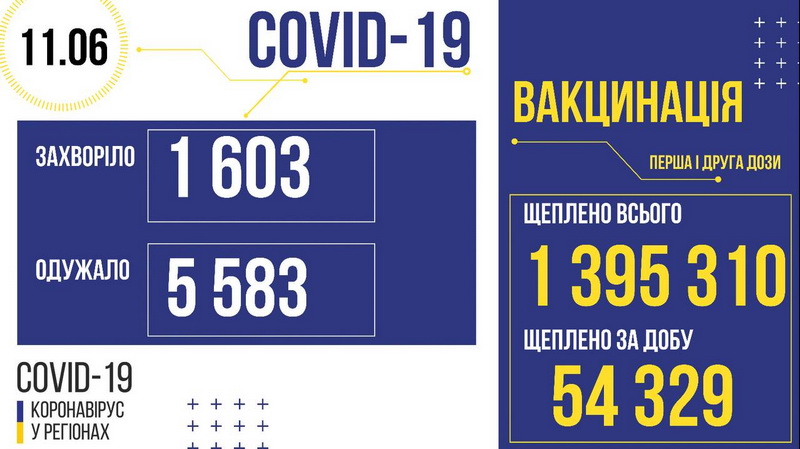 В Україні за добу одужали 5 583 людини. Захворіли – 1 603. Померли – 70. Щеплено – 30 744. Загалом проведено 1 395 310 вакцинацій.
