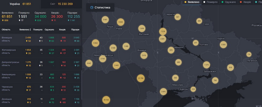 Загалом, в Україні від початку епідемії захворіли 61 851 громадянин. За минулу добу хворобу підтвердили у 856 випадках. Одужали 34 000 пацієнтів. За останню добу – 828. Померли від хвороби – 1 551. За останню добу – 17.