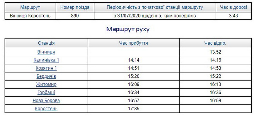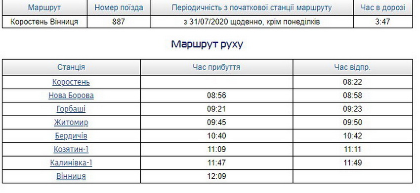 З 31-го липня відновлюють курсування регіональні поїзди № 887/888 Коростень — Вінниця та № 889/890 Вінниця — Коростень. Поїзди ходитимуть щоденно, крім понеділка.