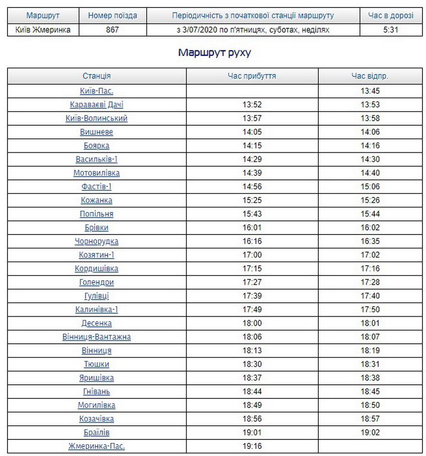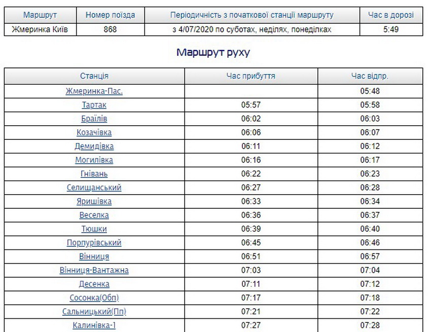 Регіональний поїзд № 867 Київ — Жмеринка курсує з 3-го липня по п’ятницях, суботах і неділях, а № 868 Жмеринка — Київ – з 4-го липня по суботах, неділях і понеділках.