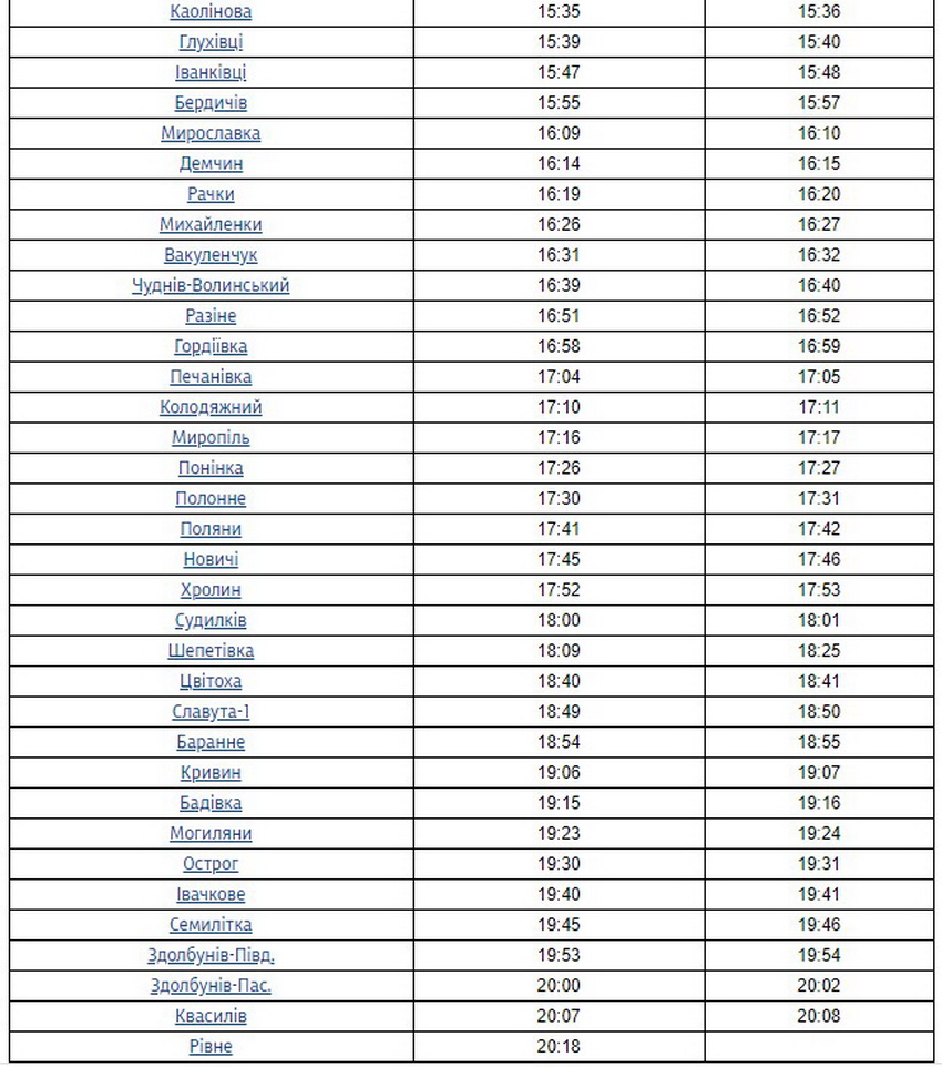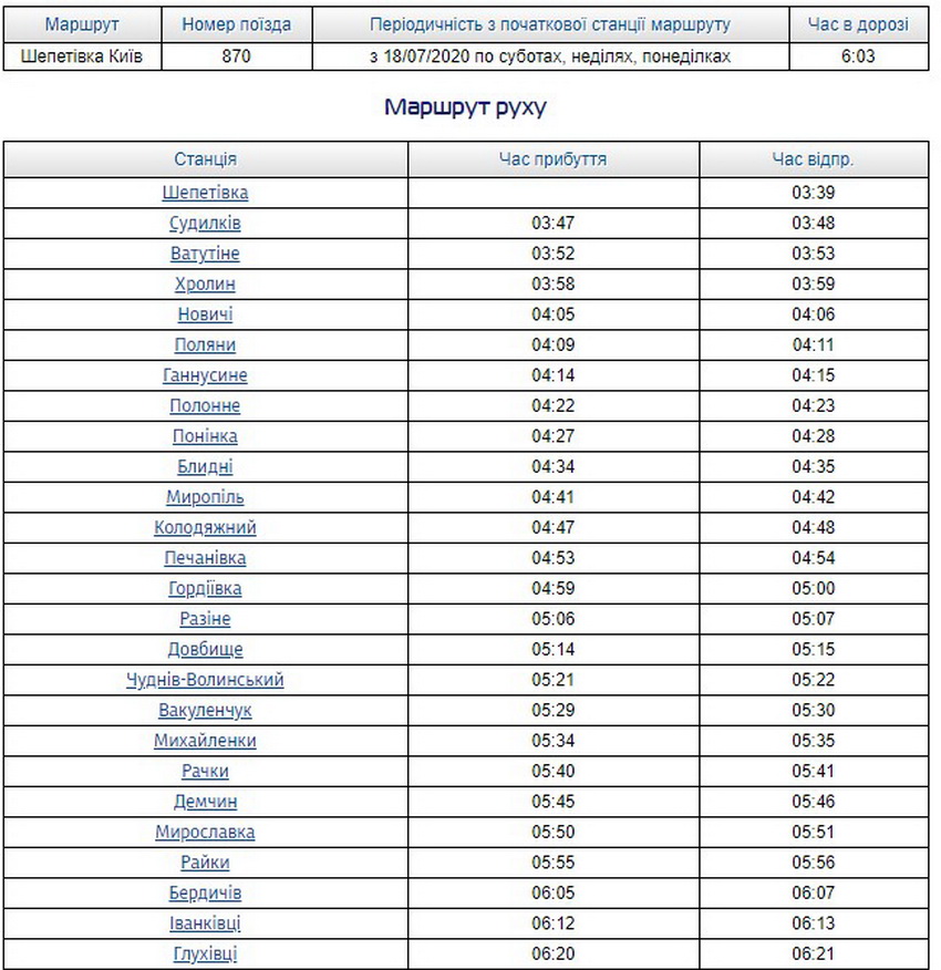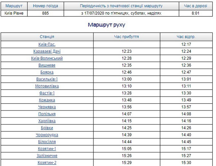 Поїзд № 870 Шепетівка — Київ курсує з 18-го липня по суботах, неділях та понеділках, а № 885 Київ — Рівне – з 17-го липня по п’ятницях, суботах і неділях.